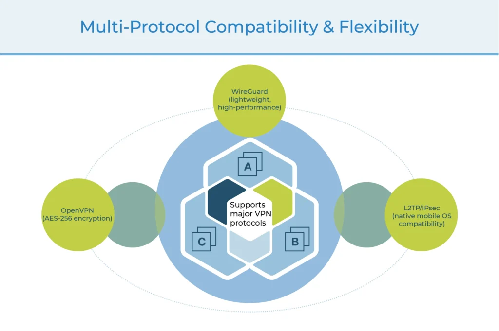 • Supports major VPN protocols: OpenVPN (AES-256 encryption), L2TP/IPsec (native mobile OS compatibility), and WireGuard (lightweight, high-performance).